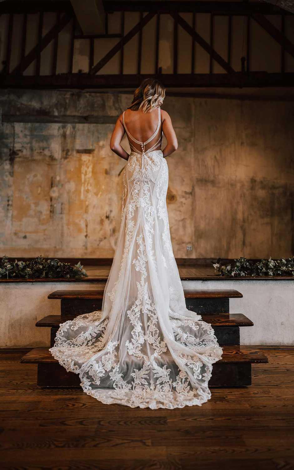 Essence of Australia #D3238 Non-Beaded Lace Column Wedding Gown with shear illusion back