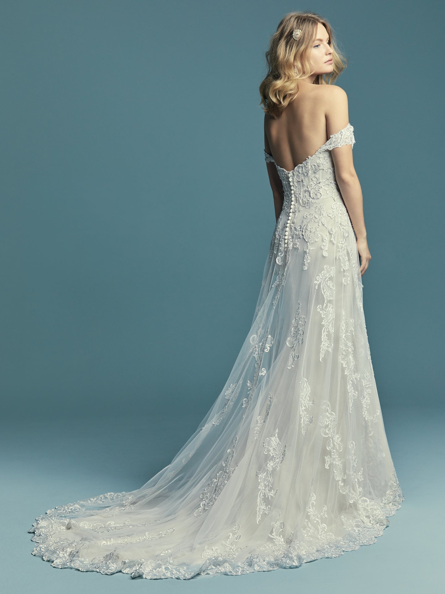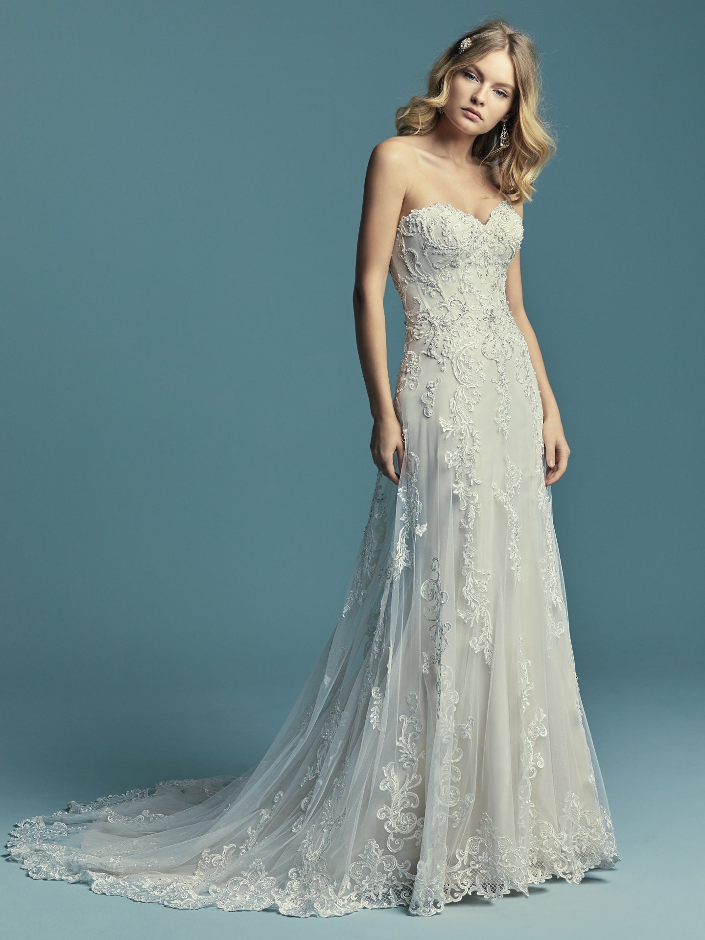 This sexy wedding dress features romantic lace motifs atop tulle. Bodice features a sweetheart neckline and exposed boning detail. Finished with covered buttons over zipper and inner elastic closure. Sheer cap sleeves accented in lace motifs can be worn on or off the shoulder, sold separately.