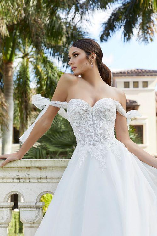 CRYSTAL BEADED, THREE-DIMENSIONAL FLORAL EMBROIDERY ON NET OVER CHANTILLY LACE BODICE WITH DETACHABLE TIE-BOW SLEEVES MEETS THE ORGANZA BALL GOWN SKIRT WITH HORSEHAIR EDGING AND CRYSTAL BUTTONS TO THE HEMLINE