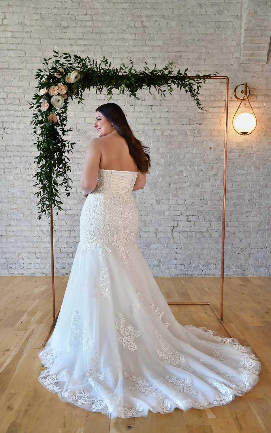 This mermaid silhouette wedding gown paired with a plunging sweetheart neckline creates an effortlessly sexy look in this plus-size wedding dress. Sparkling details in the lace pattern in the bodice and through the waist add a glittering effect, beautifully catching the light. The skirt flares out with layers of glitter tulle, adding even more shimmer to this stunner. The corset-style back pairs with fabric-covered buttons for a timeless but modern look. On the train, large-scale lace appliques adorn the skirt to the hem of the train for the ultimate bridal show-stopper.